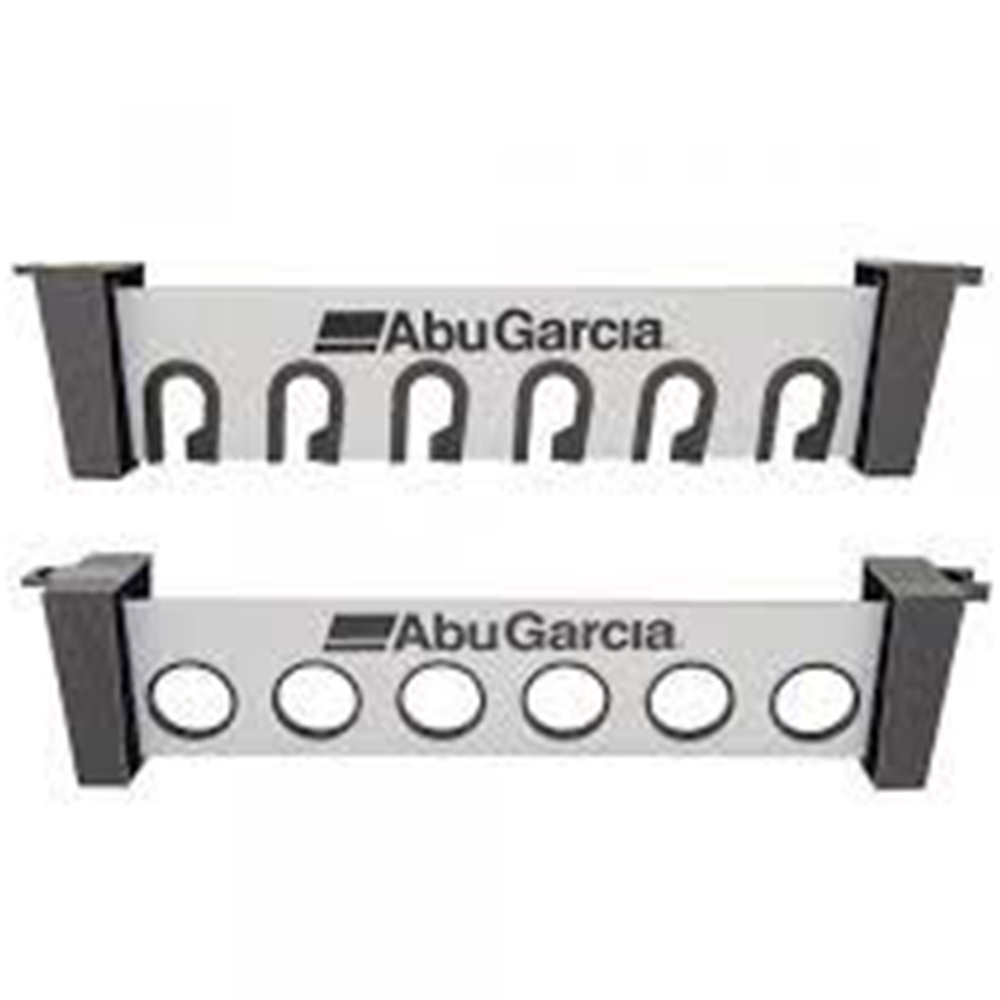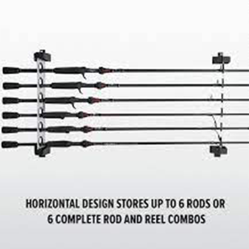 The Abu Garcia® horizontal 6-rod rack saves space while neatly and securely storing up to 6 complete rod and reel combos. Ideal for the shop, garage or boat dock. ##Use enclosed screws to attach to wood, metal, fiberglass or plastic. Use suitable wall anchor when applying to sheetrock or wallboard. Spacing between mounts vary depending on gear stoRed – recommended spacing between mounts is approximately 42″.