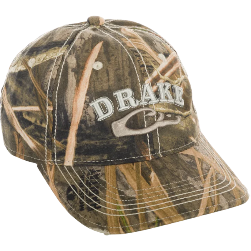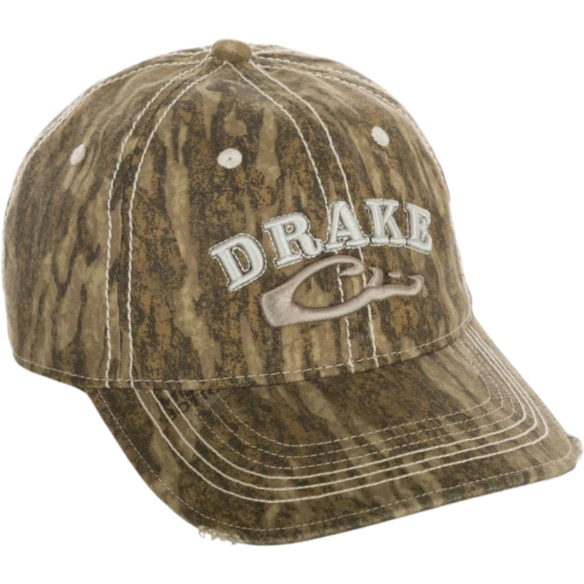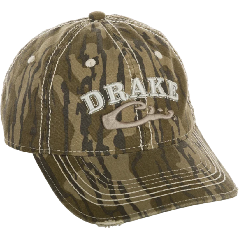 The Drake Distressed Six Panel Cap is a weathered cotton, non–structured six panel combined with a hook and loop closure.  This cap has a traditional shape and a slightly pre-curved visor. The visor is frayed, and the front panels feature a raised Drake Logo embroidery. The crown has contrast stitching as well. This dad cap feels like an old favorite; it is broken in and ready to become one of your go to caps from our Drake Logo Series.ÂÂ